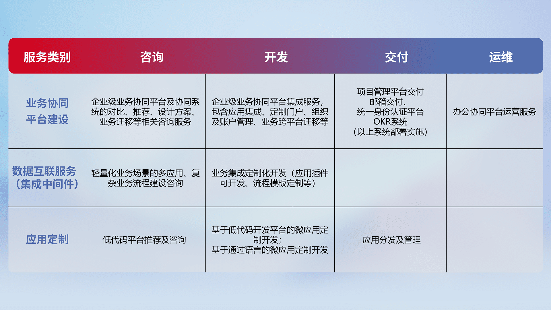 针对钉钉、、、、企微、、、IDaas等平台级产品提供产品的规划、、、方案、、、交付、、、、定制化开发等服务,,,实现如统一协同办公、、、、智能客户服务、、混合会议管理、、、、智能数据查询、、、等业务场景,,,,实现数字化转型。。。。